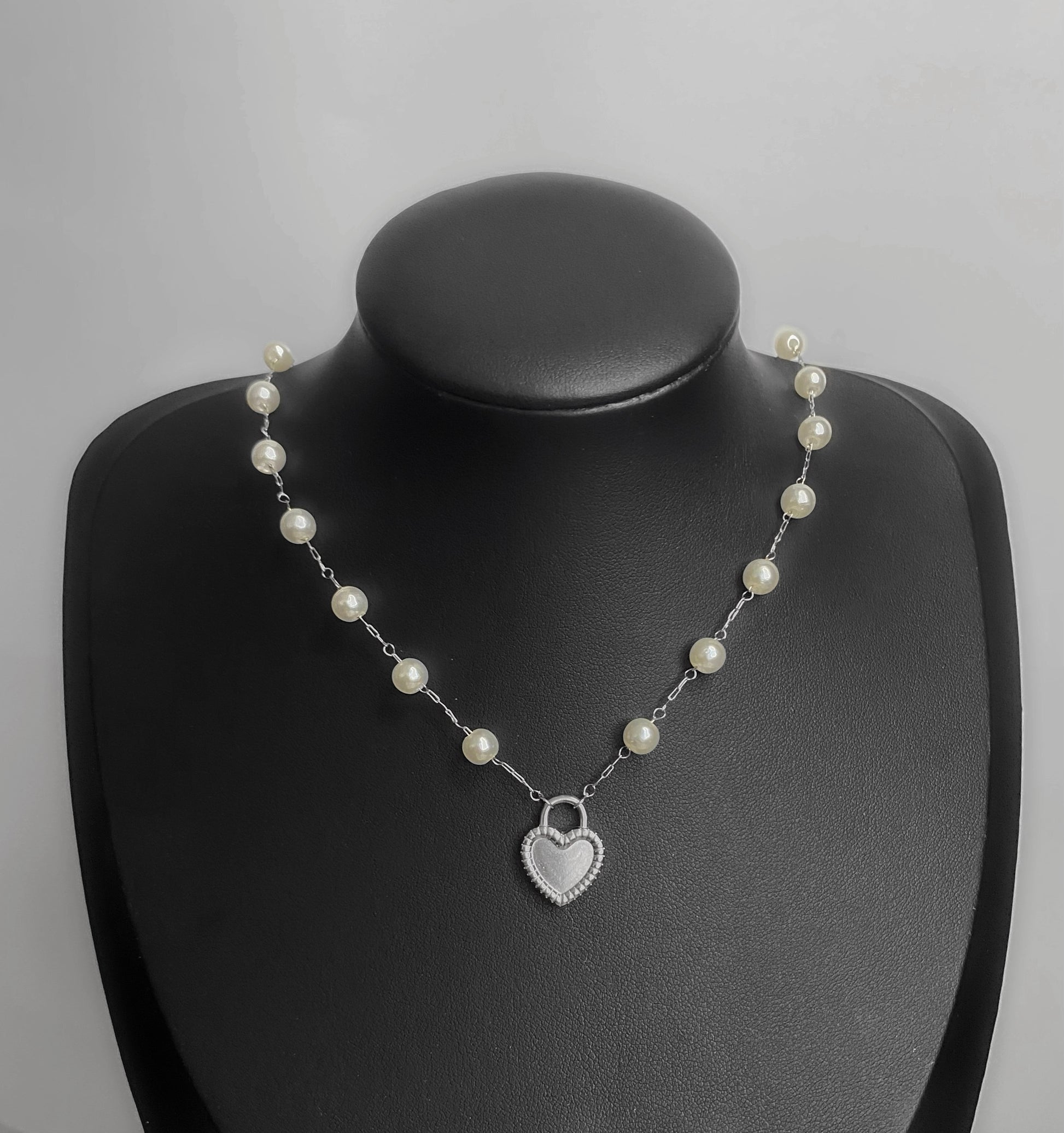 stainless steel chain and closing parts, pretty off white immitation pearls & a cute stainless steel heart lock charm.